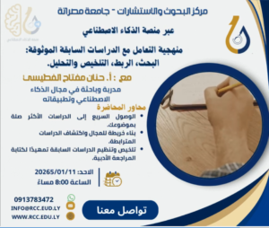 يسرّ مركز البحوث والاستشارات بجامعة مصراتة أن يعلن عن محاضرة علمية جديدة ضمن أنشطة منصة الذكاء الاصطناعي بعنوان: