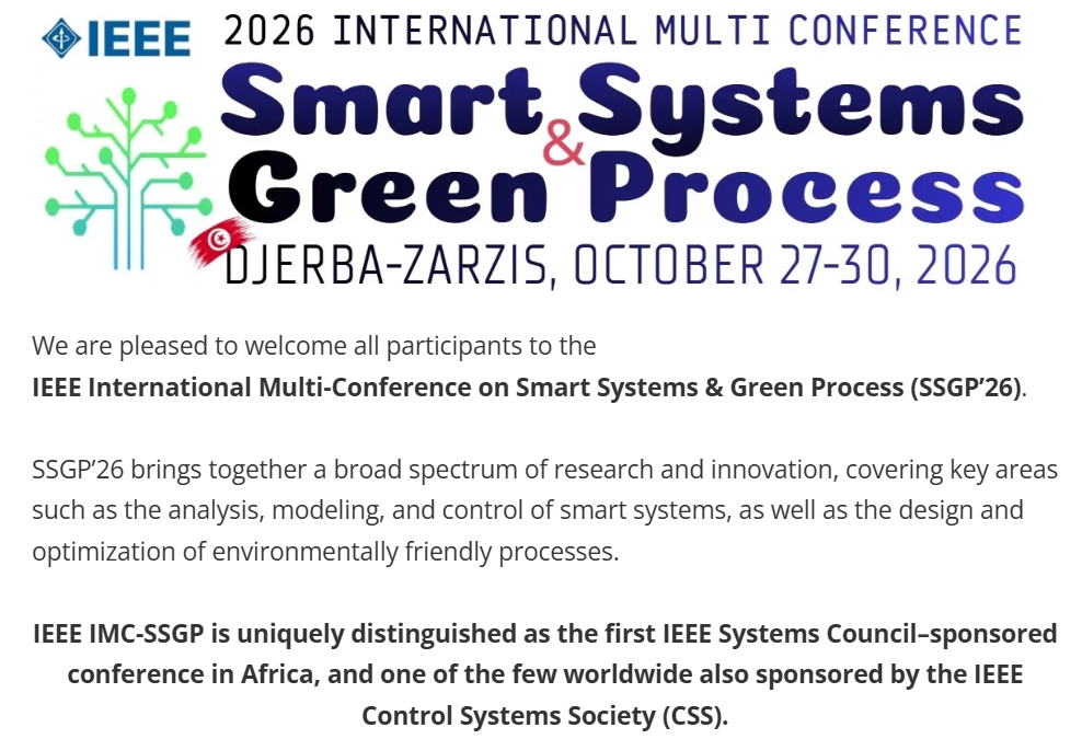 مؤتمر SSGP’26 هو مؤتمر تابع لمعهد مهندسي الكهرباء والإلكترونيات (رقم التسجيل 71016)، ويحظى برعاية مالية من جمعية ASICS وفرع معهد مهندسي الكهرباء والإلكترونيات في تونس. وينظم هذا الحدث المعهد العالي للأنظمة الصناعية بقابس (ISSIG) ومختبر أبحاث MACS (نمذجة وتحليل ومراقبة الأنظمة).