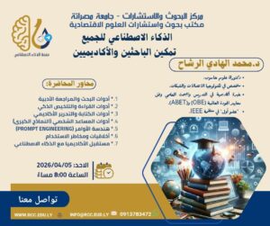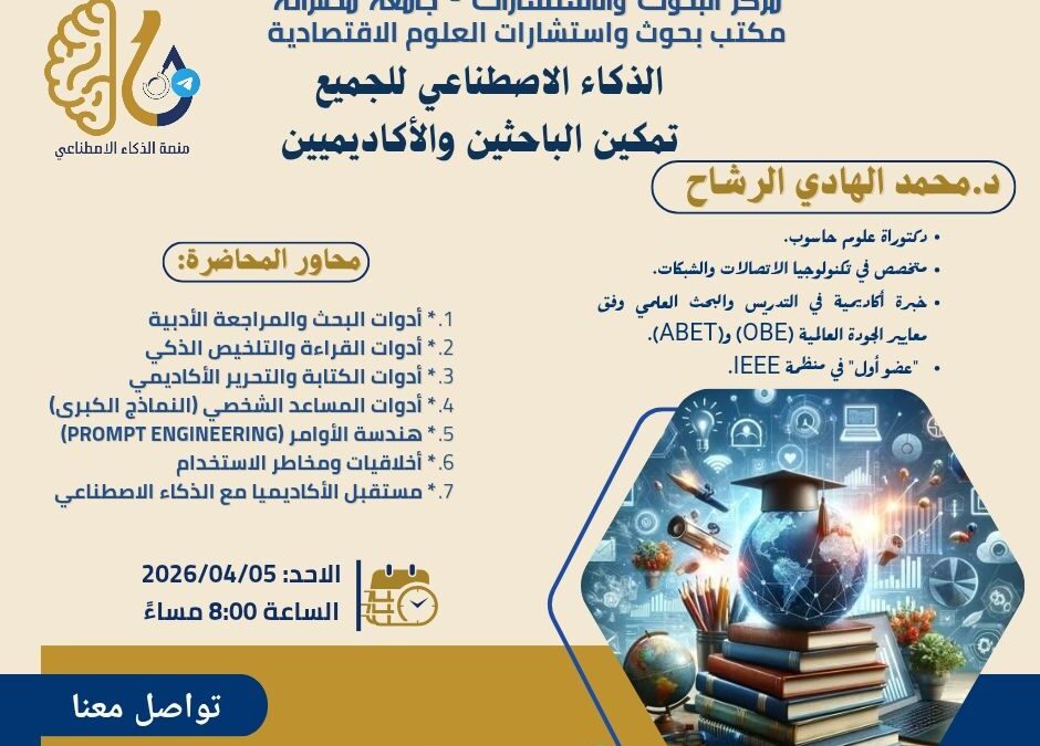وتأتي هذه المحاضرة في إطار جهود المركز لدعم الباحثين والأكاديميين وتمكينهم من الاستفادة من أدوات الذكاء الاصطناعي في تطوير البحث العلمي والنشر الأكاديمي.